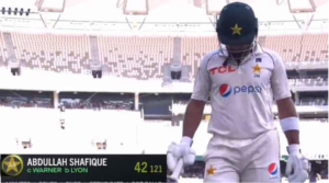 جب قومی ٹیم کا اسکور 74 رنز پر پہنچا تو عبد اللہ شفیق ناتھن لیون کی گیند پر لیگ سلپ میں ڈیوڈ وارنر کے ہاتھوں کیچ آؤٹ ہو گئے، انہوں نے 42 رنز کی اننگز کھیلی۔